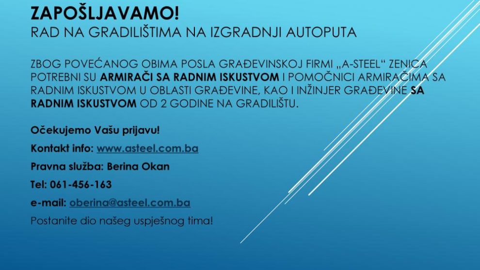 Zapošljavamo! Zbog povećanog obima posla građevinskoj firmi “A-Steel” Zenica potrebni su ARMIRAČI SA RADNIM ISKUSTVOM i pomoćnici armiračima sa radnim iskustvom u oblasti građevine, kao i inžinjer građevine sa radnim iskustvom na gradilištu od 2 godine.