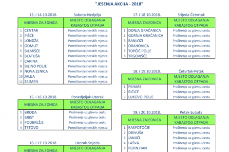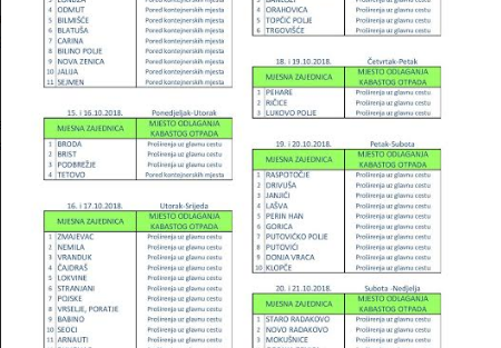 Obavještavaju se građani iz navedenih mjesnih zajednica da svoj kabasti otpad (stari namještaj, otpad bijele tehnike, dotrajale aparate iz domaćinstva, elektronske i druge kabaste predmete) odlože pored proširenja uz glavnu cestu u zakazane dane odvoza.