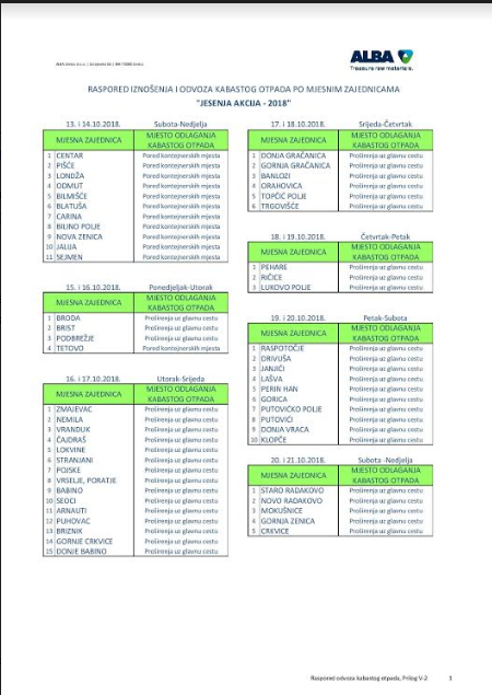 Preduzeće „ALBA Zenica“ d.o.o. Zenica obavještava građane, cijenjene korisnike svojih usluga, da je u toku prikupljanje i odvoz kabastog otpada po mjesnim zajednicama Grada Zenica, u kojima je uspostavljen sistem organizovanog odvoza otpada, prema prethodno utvrđenom rasporedu, a koje će trajati do sve do 21.10.2018. godine.