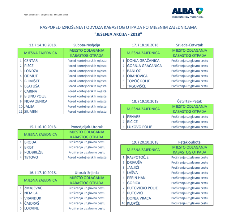 Preduzeće „ALBA Zenica“ d.o.o. Zenica obavještava građane, cijenjene korisnike svojih usluga, da će se u periodu od 13.10. – 21.10.2018. godine vršiti prikupljanje i odvoz kabastog otpada po mjesnim zajednicama Grada Zenica, u kojima je uspostavljen sistem organizovanog odvoza otpada, prema prethodno utvrđenom rasporedu.
