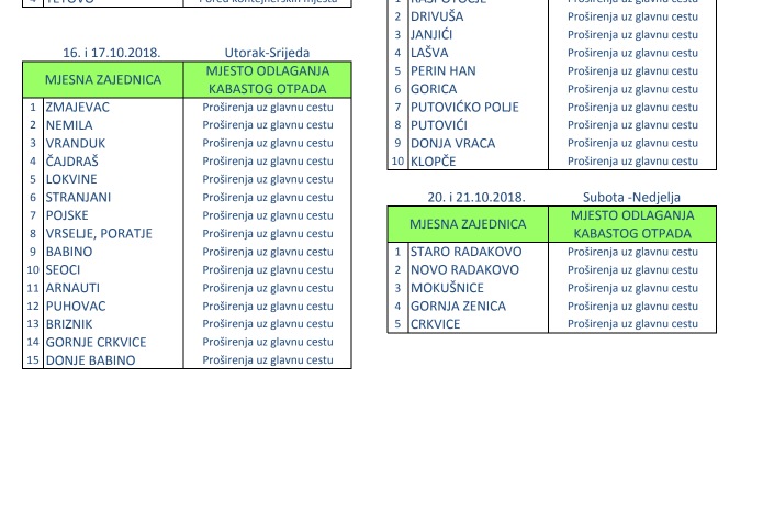 Obavještavaju se građani iz navedenih mjesnih zajednica da svoj kabasti otpad (stari namještaj, otpad bijele tehnike, dotrajale aparate iz domaćinstva, elektronske i druge kabaste predmete) odlože pored proširenja uz glavnu cestu u zakazane dane odvoza.