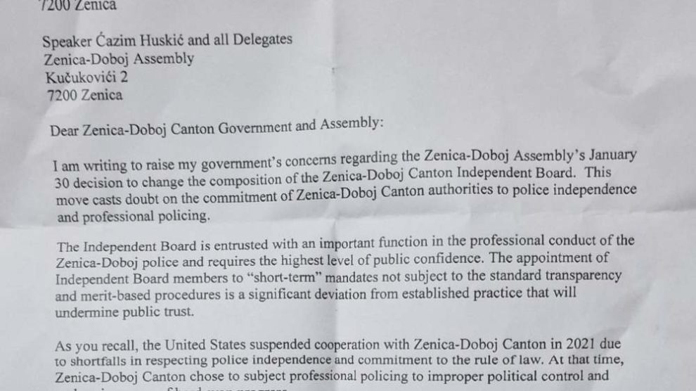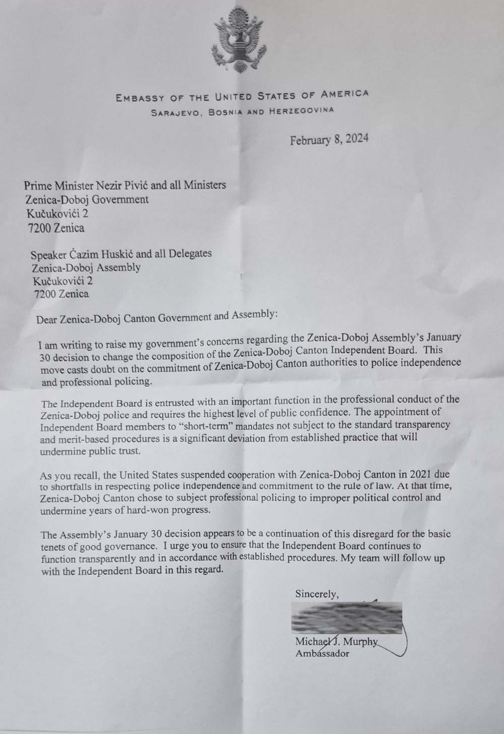 U Pismu ambasador Marfi izražava i prenosi zabrinutost “njegove vlade” odlukom zastupnika Skupštine ZDK od 30. januara, u vezi promjene pojedinih članova Nezavisnog odbora ZDK. Ambasador u Pismu sa datumom 8.2. kaže da “ovaj potez dovodi u sumnju opredijeljenost vlasti Zeničko-dobojskog kantona za policijsku neovisnost i profesionalni rad policije”.