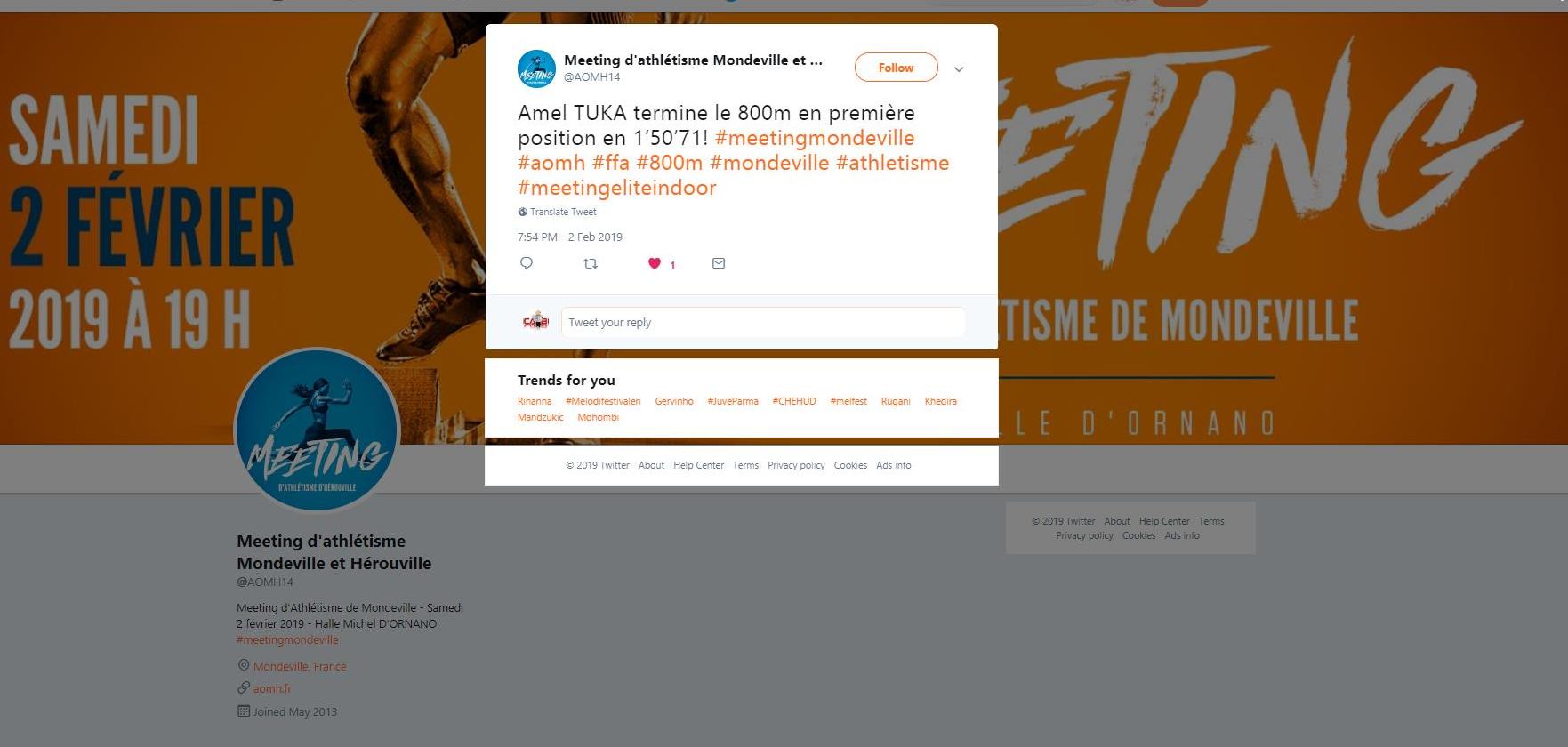 Amel Tuka pobjedio na 800 metara u francuskom Mondevilu – Amel Tuka, naš sugrađanin i bh. najbolji atletičar, nakon što je 27. januara je u Padovi na atletskom mitingu otrčao prvu utrku u sezoni na 400 metara, koju je pobjedio istrčavši je u vremenu 47.29, večeras (subota, 2.2.2) je bio najbolji na 800 metara na atletskom mitingu u francuskom Mondevilu.