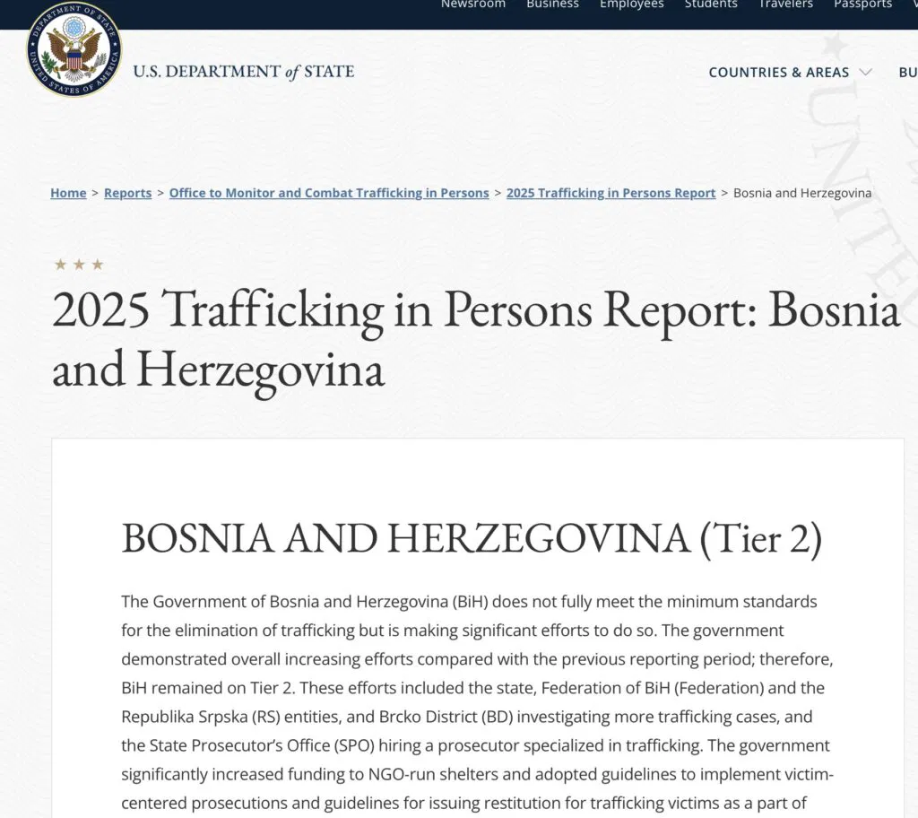 Ističe se da su bh. vlasti pokazale sveukupno povećane napore u poređenju s prethodnim izvještajnim periodom, no BiH je i dalje ostala na tzv. Tier 2 listi. Inače, na spomenutoj Tier 2 listi State Departmenta nalaze se zemlje koje ne ispunjavaju u potpunosti minimalne standarde za eliminaciju trgovine ljudima, ali ulažu značajne napore da to postignu.