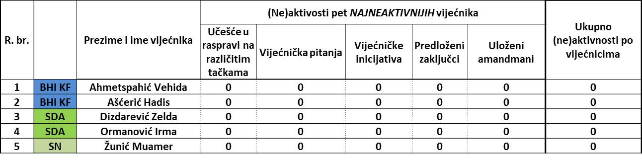 Pet vijećnika, odnosno tri vijećnice i dva vijećnika, nisu zabilježeni u evidenciji BILO KAKVE aktivnosti, koje dakle uključuju – učešće u raspravi na nekoj tački dnevnog reda, vijećničko pitanje, inicijativu, predloženi zaključak ili amandman. Nula. Ništa.