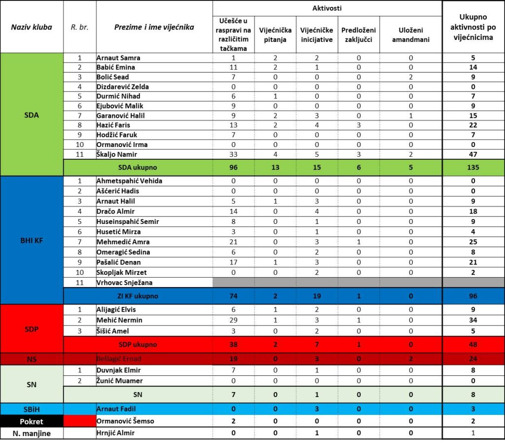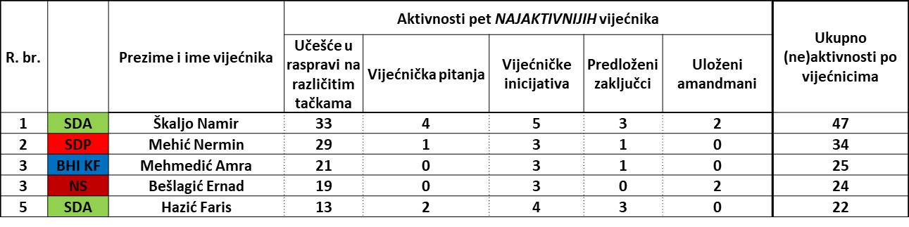 Pojedinačno, najaktivniji je Namir Škaljo (SDA) sa 47 aktivnosti (33 učešća u raspravi, četiri vijećnička pitanja, pet inicijativa, tri predložena zaključka i dva uložena amandmana).