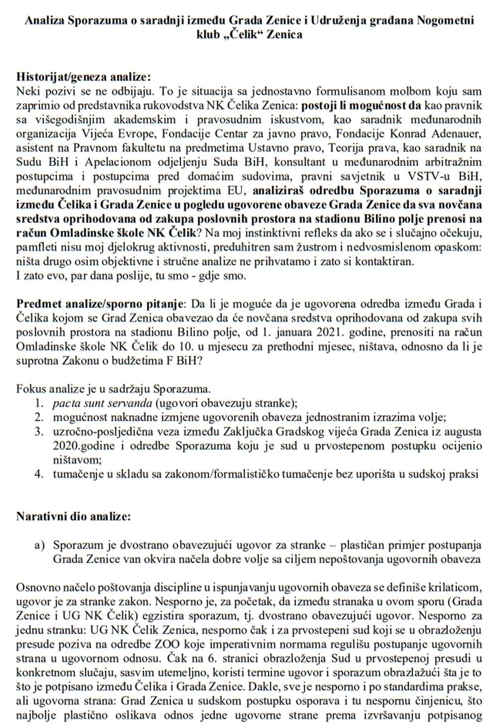 Neki pozivi se ne odbijaju. To je situacija sa jednostavno formulisanom molbom koju sam zaprimio od predstavnika rukovodstva NK Čelika Zenica: postoji li mogućnost da kao pravnik sa višegodišnjim akademskim i pravosudnim iskustvom, kao saradnik međunarodnih organizacija Vijeća Evrope, Fondacije Centar za javno pravo, Fondacije Konrad Adenauer, asistent na Pravnom fakultetu na predmetima Ustavno pravo, Teorija prava, kao saradnik na Sudu BiH i Apelacionom odjeljenju Suda BiH, konsultant u međunarodnim arbitražnim postupcima i postupcima pred domaćim sudovima, pravni savjetnik u VSTV-u BiH, međunarodnim pravosudnim projektima EU, analiziraš odredbu Sporazuma o saradnji između Čelika i Grada Zenice u pogledu ugovorene obaveze Grada Zenice da sva novčana sredstva oprihodovana od zakupa poslovnih prostora na stadionu Bilino polje prenosi na