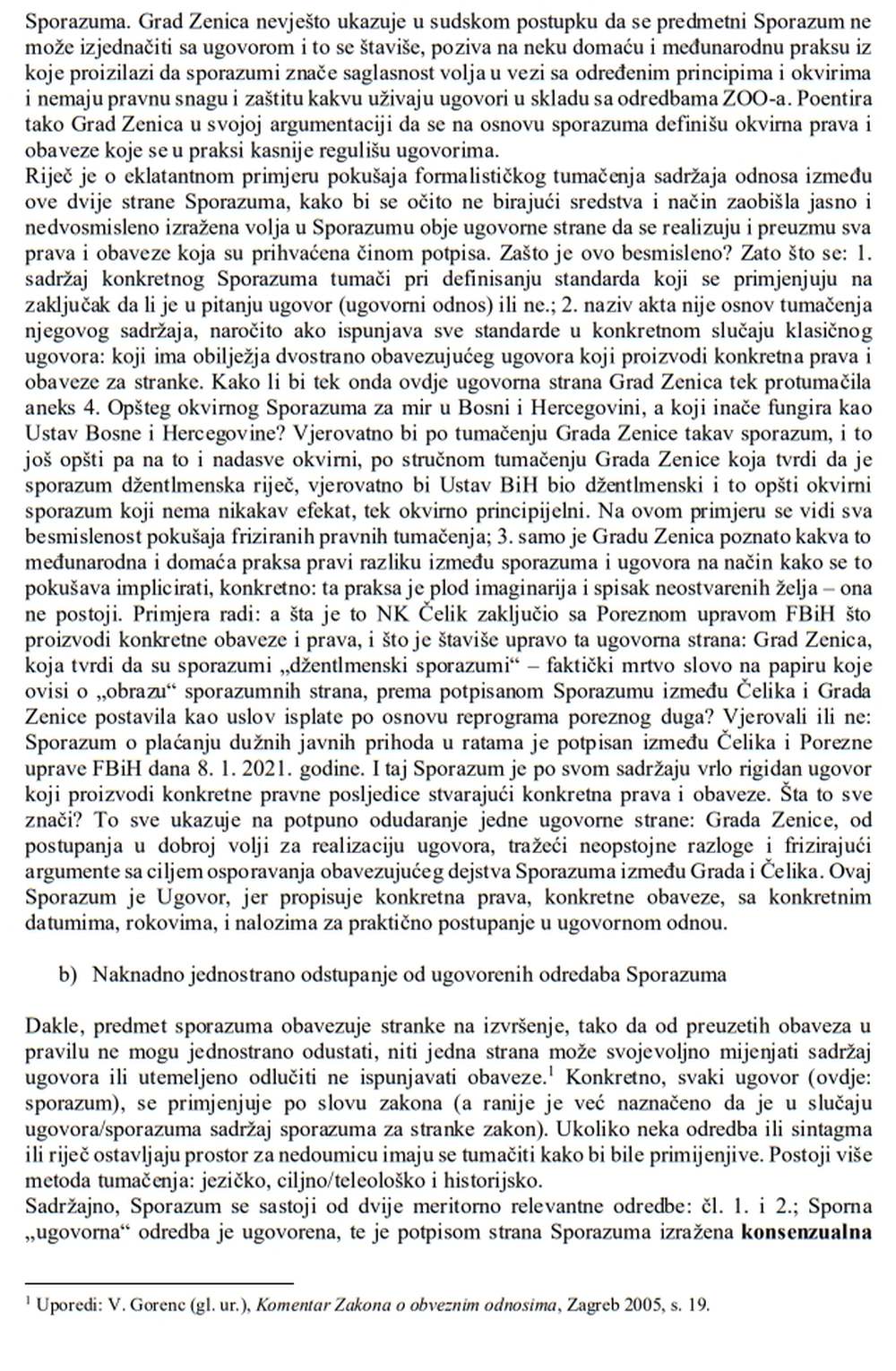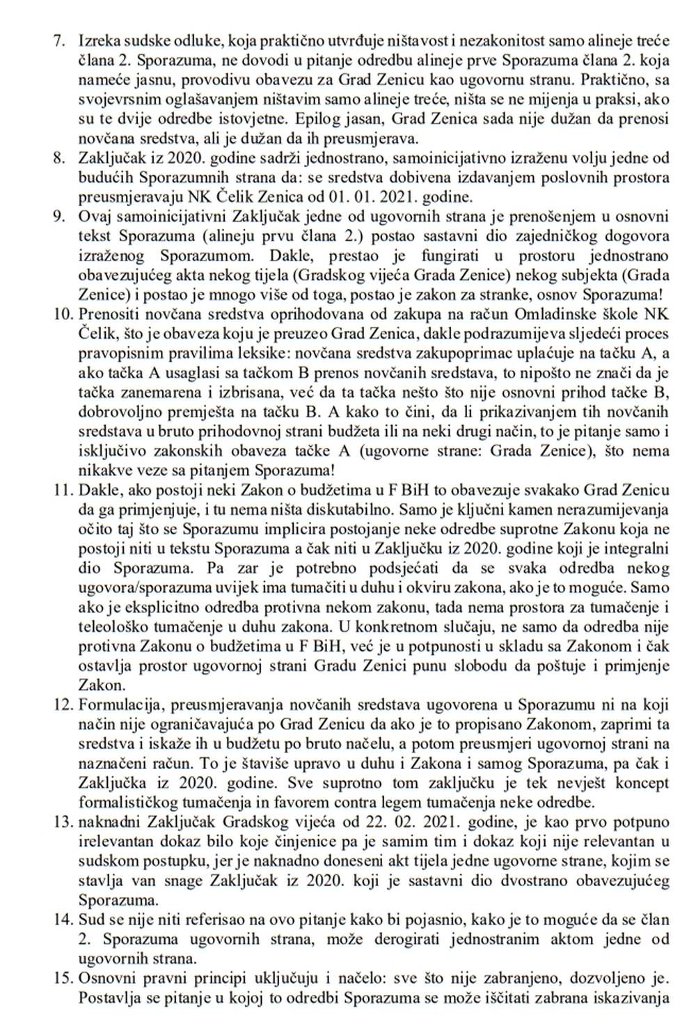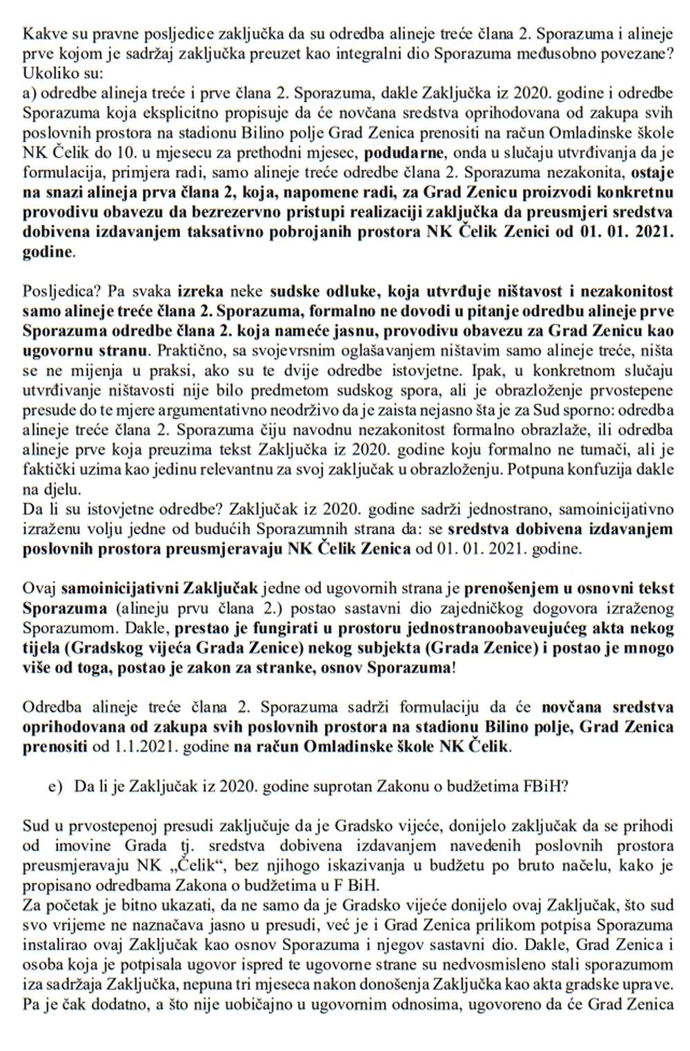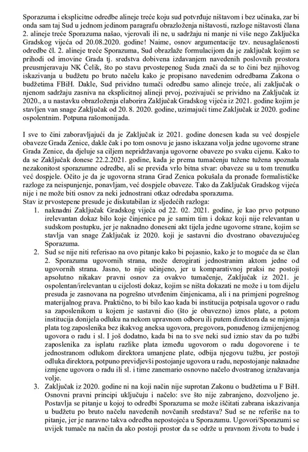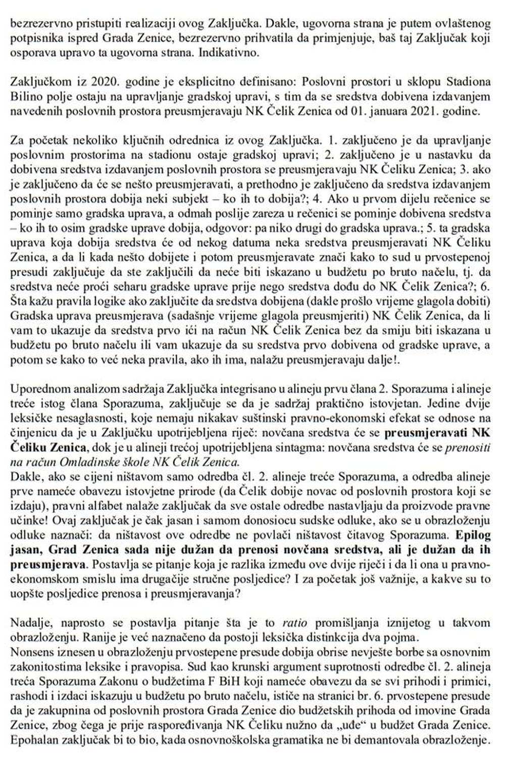 Kako bismo javnosti u što većoj mjeri dočarali koliko je nerazumna, neshvatljiva i pogrešna prvostepena presuda Općinskog suda u Zenici koji je odbacio tužbeni zahtjev NK Čelik Zenica protiv Grada Zenica, objavljujemo stručnu analizu Sporazuma i same presude koju je za klub napisao nezavisni pravni stručnjak s višegodišnjim pravosudnim i akademskim iskustvom – Demirel Delić.