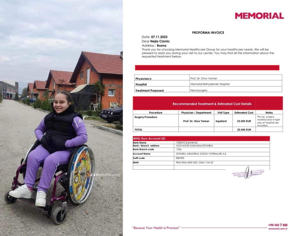 Nejla treba našu ruku, naš doprinos, podršku u vidu donacija kako bi prebrodila najnovije izazove. Za operaciju glave zbog Chiari malformacije i operaciju kičme zbog skolioze potrebno je 84.630,00 KM.