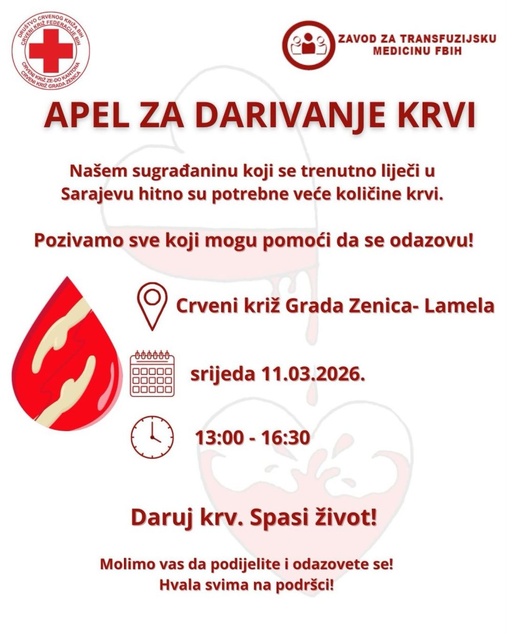 Pozivamo sve dobrovoljne davaoce krvi koji su u mogućnosti da pomognu.