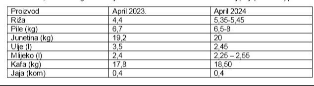 Trenutne cijene ne pokazuju trend opadanja u odnosu na april prošle godine. Poređenjem cijena nekoliko osnovnih proizvoda evidentno je da će troškovi života i dalje rasti. Prosječne cijene kilograma riže u aprilu 2023. iznosile su 4,4 KM, a na policama trgovina trenutno su oko 5,35 KM.