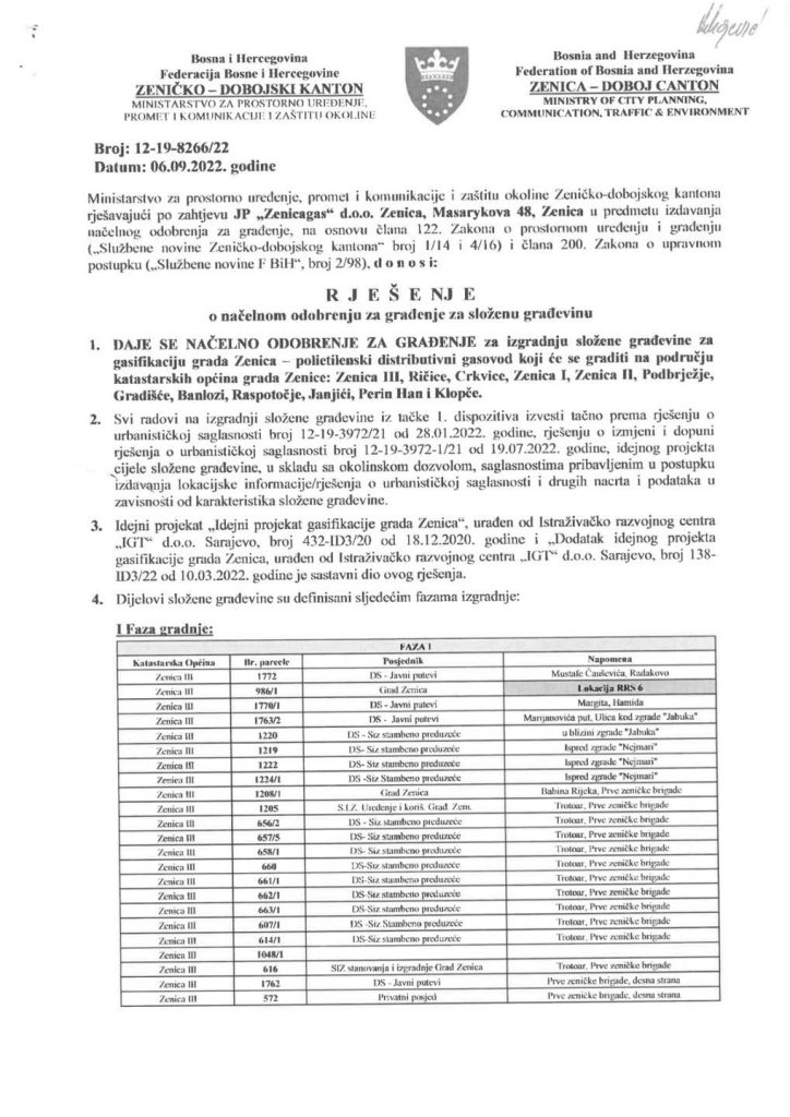 Ministarstvo za prostorno uređenje, promet i komunikacije i zaštitu okoline Zeničko-dobojskog kantona izdalo je načelno odobrenje za izgradnju složene građevine za gasifikaciju Grada Zenica.