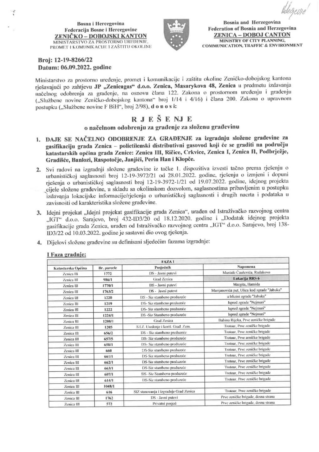 Ministarstvo za prostorno uređenje, promet i komunikacije i zaštitu okoline Zeničko-dobojskog kantona izdalo je načelno odobrenje za izgradnju složene građevine za gasifikaciju Grada Zenica.