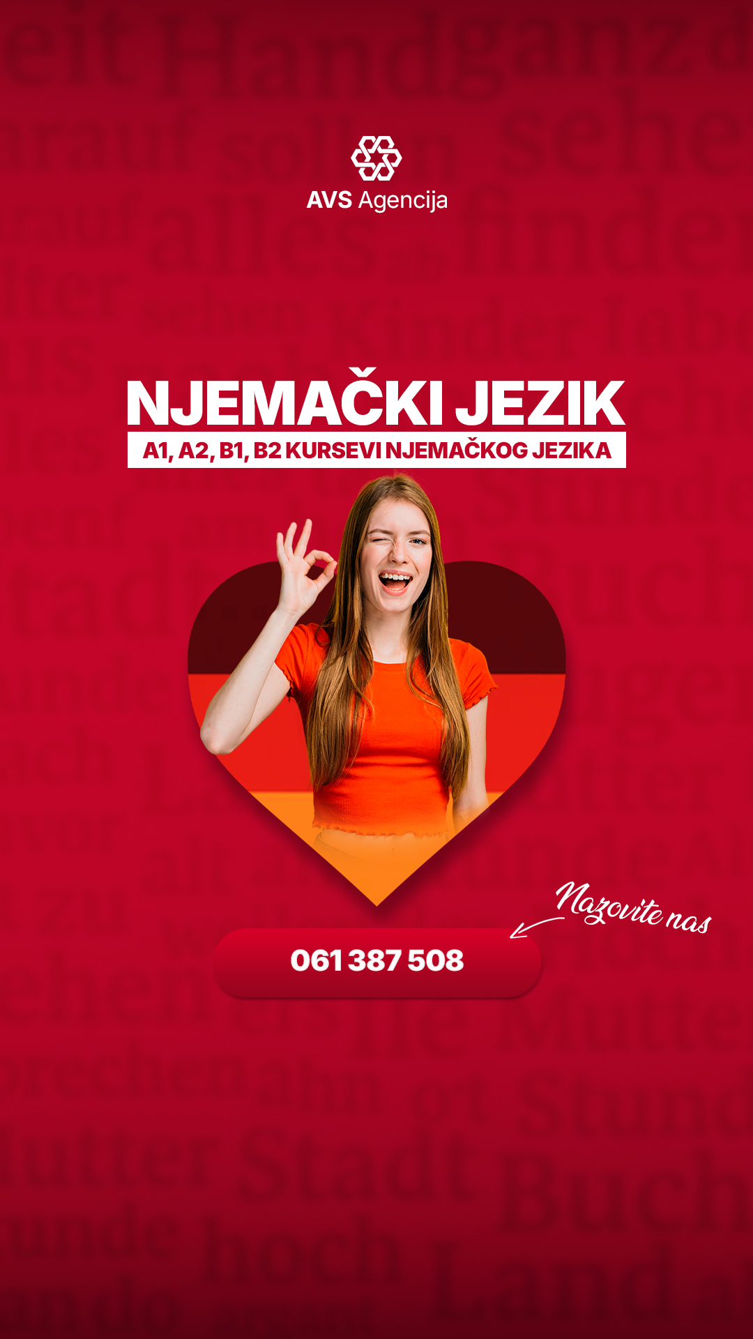 AVS Agencija vam nudi kvalitetne i temeljne kurseve njemačkog jezika na nivoima A1, A2, B1 i B2, prilagođene vašem predznanju i ciljevima.