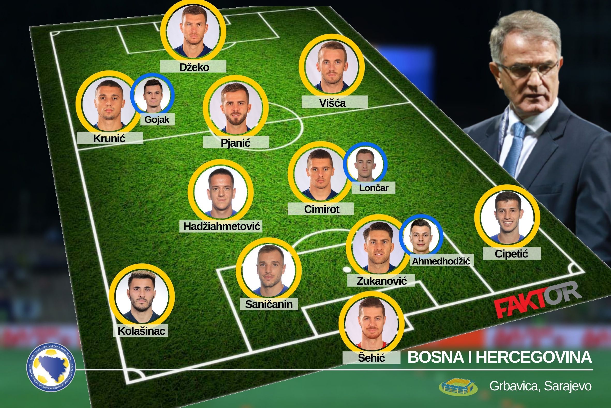 Bajević će imati i širok izbor kada je u pitanju vezni red. Povratnik Miralem Pjanić (zbog koronavirusa nije ga bilo protiv Italije i Poljske) siguran je u startnoj postavi dok bi mu društvo na sredini terena trebala praviti dvojica od ove trojice igrača – Amir Hadžiahmetović, Gojko Cimirot i Stjepan Lončar.