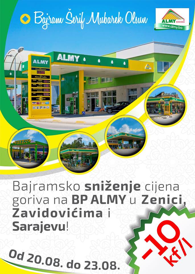 Bajramsko sniženje cijena goriva na BP ALMY – Tradicionalno bajramsko sniženje cijena goriva na BP ALMY u Zenici, Zavidovićima i Sarajevu, od 10kf/l za sve kupce koji izvrše točenje goriva u periodu od 20.08. do 23.08. 2018.
