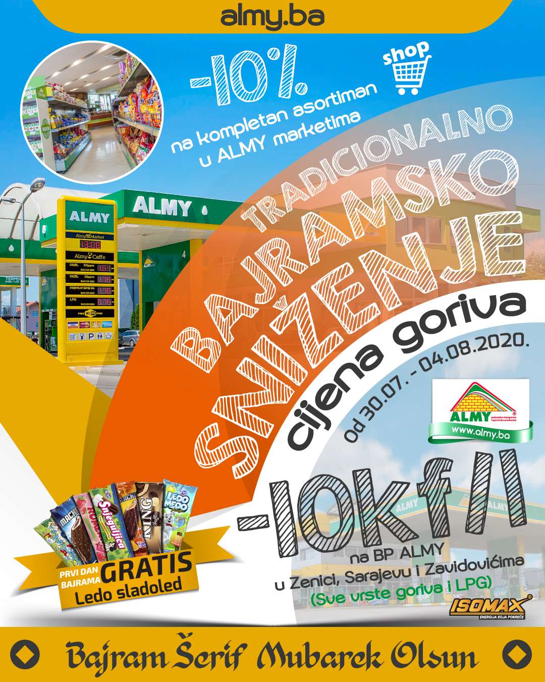Bajramsko sniženje cijena goriva – Tradicionalno sniženje cijena goriva ISOMAX i LPG plina za -10kf/L za vrijeme Kurban bajrama i ove godine samo na benzinskim pumpama Almy u Zenici, Sarajevu i Zavidovićima.