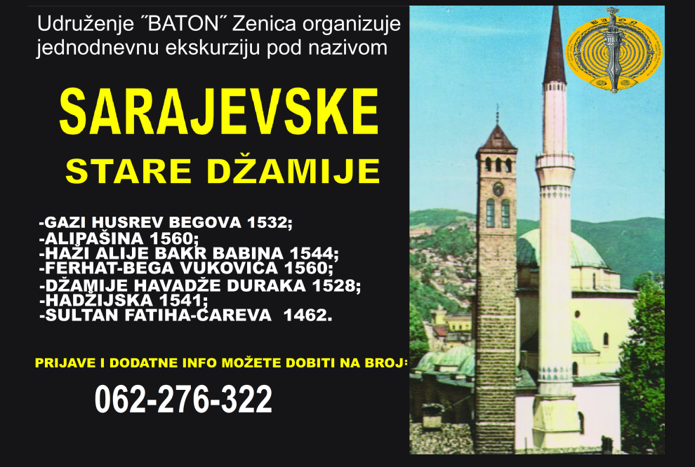 U cilju resocijalizacije, edukacije, kulturne afirmacije, te isticanja svih historijskih znamenitosti naše domovine Bosne i Hercegovine, Udruženje „BATON“ Zenica organizuje edukativnu ekskurziju pod nazivom: SARAJEVSKE STARE DŽAMIJE. Posebno nam je zadovoljstvo da poslije povlačenja Covid mjera smo ponovo u prilici da organizujemo ovu edukativnu ekskurziju koja je planirana da se realizuje krajem mjeseca maja 2022. godine,