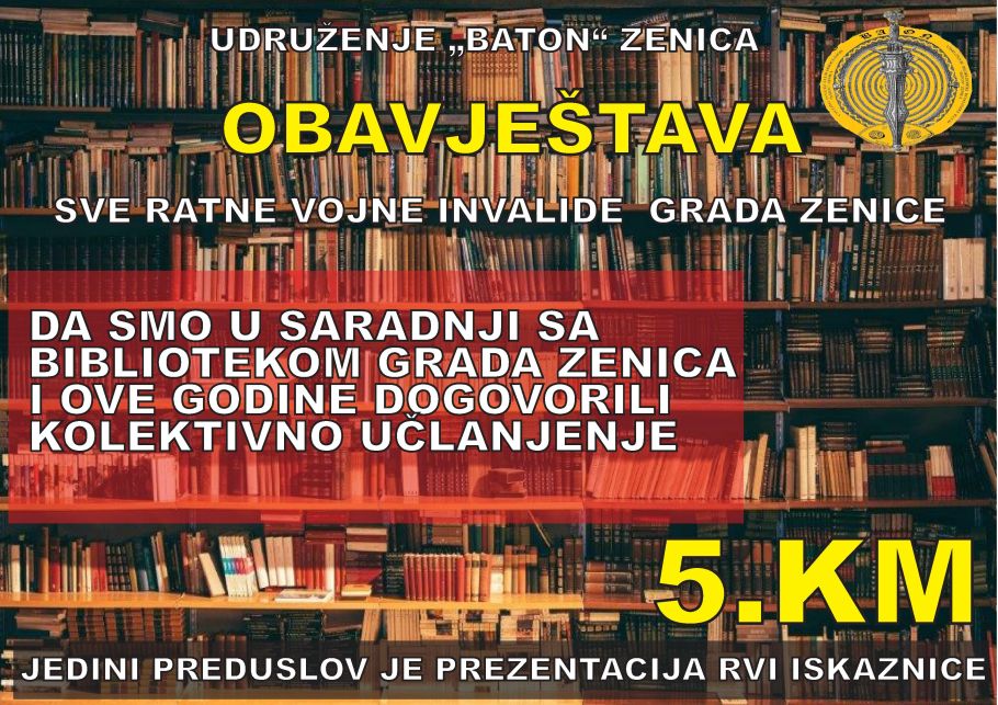 U cilju resocijalizacije, edukacije i kulturne afirmacije te konstalnom iznalaženju rješenja i alternativa u borbi sa PTSP i ratnim traumama, udruženje „Baton“ Zenica obavještava sve ratne vojne invalide Grada Zenice, da smo i ove godine nastavili uspješnu dugogodišnju poslovnu saradnju sa Bibliotekom Grada Zenica.