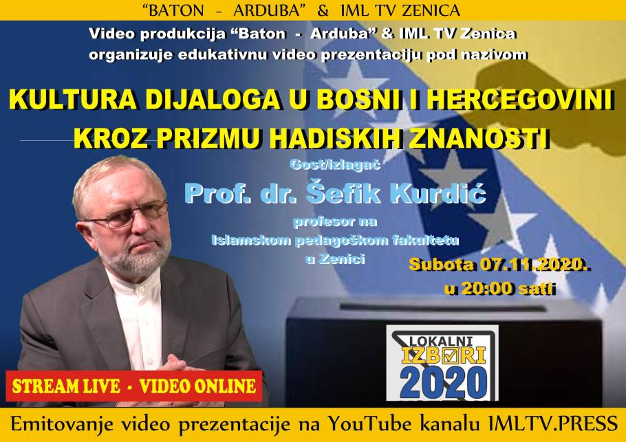 Obzirom da su ove prezentacije stream Live Video Online, ovim putem posebno nam je zadovoljstvo da najavljujemo drugu po redu tribinu u kojoj će prof. dr. Šefik Kurdić, profesor na Islamskom pedagoškom fakultetu u Zenici, ponuditi osvrt na kulturu dijaloga tokom izbora kroz prizmu hadiskih znanosti.