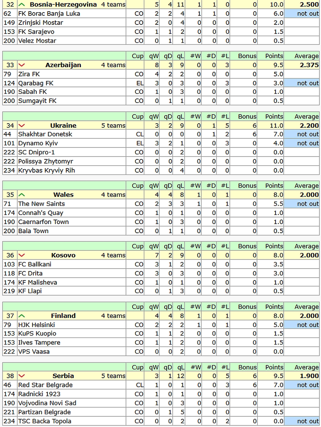 Prema pravilima UEFA-e, ukupni koeficijent poeni se dijele sa brojem klubova predstavnika te zemlje i dobije se koeficijent za državu. U ovom slučaju 10.000 se dijeli na četiri bh. kluba i dolazimo do brojke 2.500.