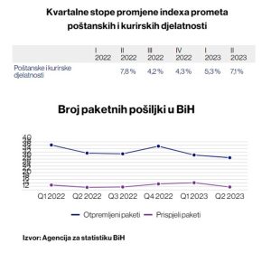 Prema posljednjim podacima Agencije za statistiku BiH, u drugom kvartalu ove godine u poređenju s prvim kvartalom u segmentu poštanskih i kurirskih djelatnosti zabilježen je rast prometa od 7,1 posto unatoč smanjenju broja pismonosnih i poštanskih pošiljki.