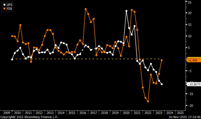 Klaskow navodi da bi prosječni dnevni volumen paketa (ADV) UPS Domestica mogao porasti za niski jednocifreni postotak nakon pada od 8,1 posto u 2023.