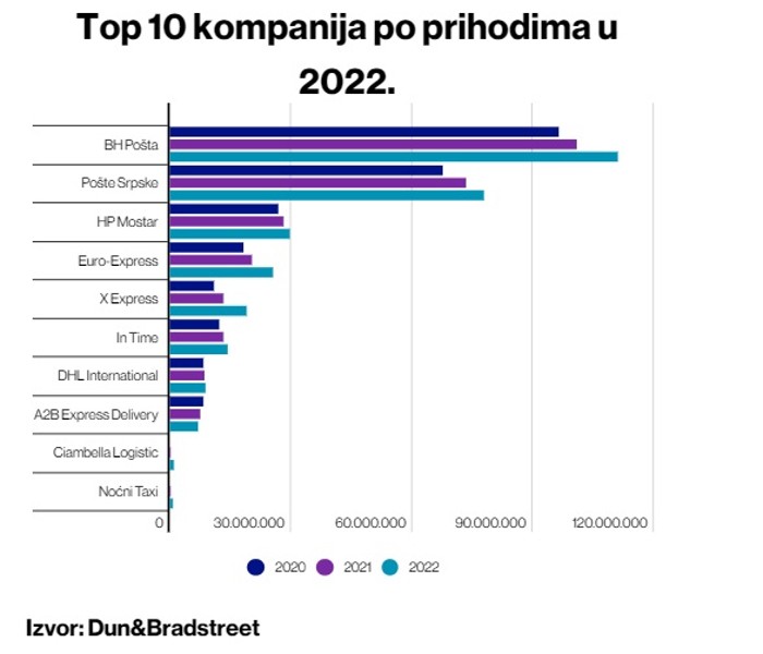Prve tri na listi po prihodima su BH Pošta, Pošte Srpske i Hrvatske pošte Mostar – tri kompanije koje su u većinskom državnom vlasništvu.