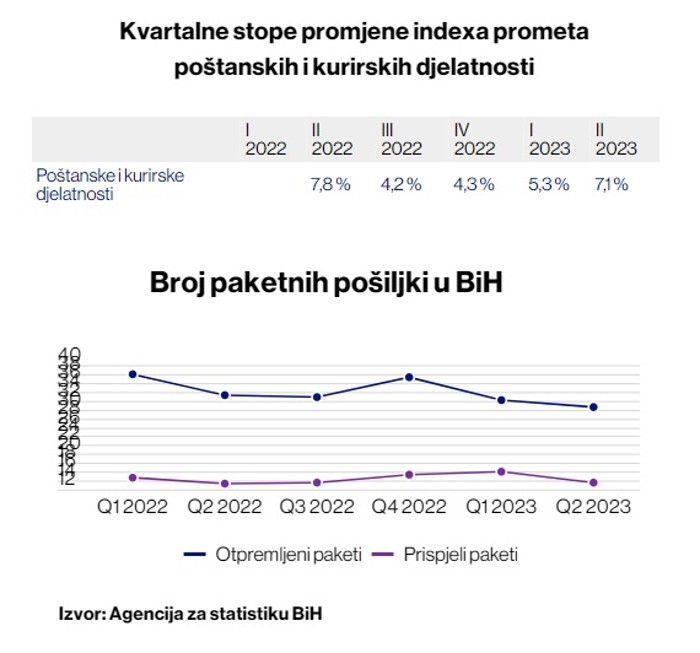 Prema posljednjim podacima Agencije za statistiku BiH, u drugom kvartalu ove godine u poređenju s prvim kvartalom u segmentu poštanskih i kurirskih djelatnosti zabilježen je rast prometa od 7,1 posto unatoč smanjenju broja pismonosnih i poštanskih pošiljki.