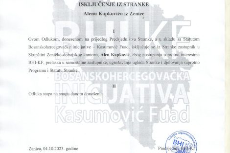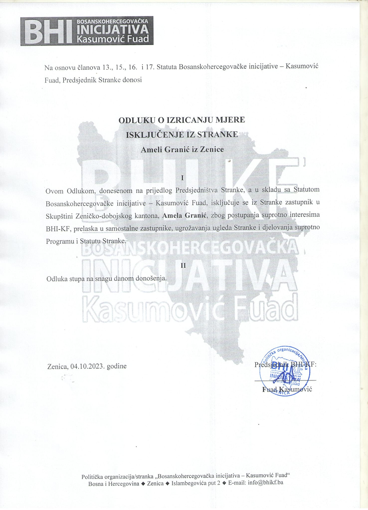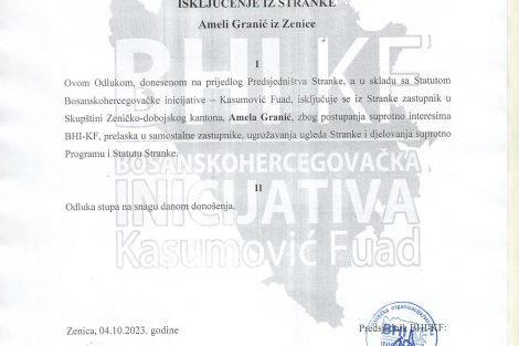 IZ BHI-KF su naveli: “Donesene su Odluke o izricanju mjere isključenja iz stranke kantonalnim zastupnicima Ameli Granić i Alenu Kapkoviću, zbog postupanja suprotno interesima BHI-KF, ulaska u novu koaliciju u Skupštini Zeničko-dobojskog kantona sa Strankom demokratske akcije, te izdaje svojih glasača.”
