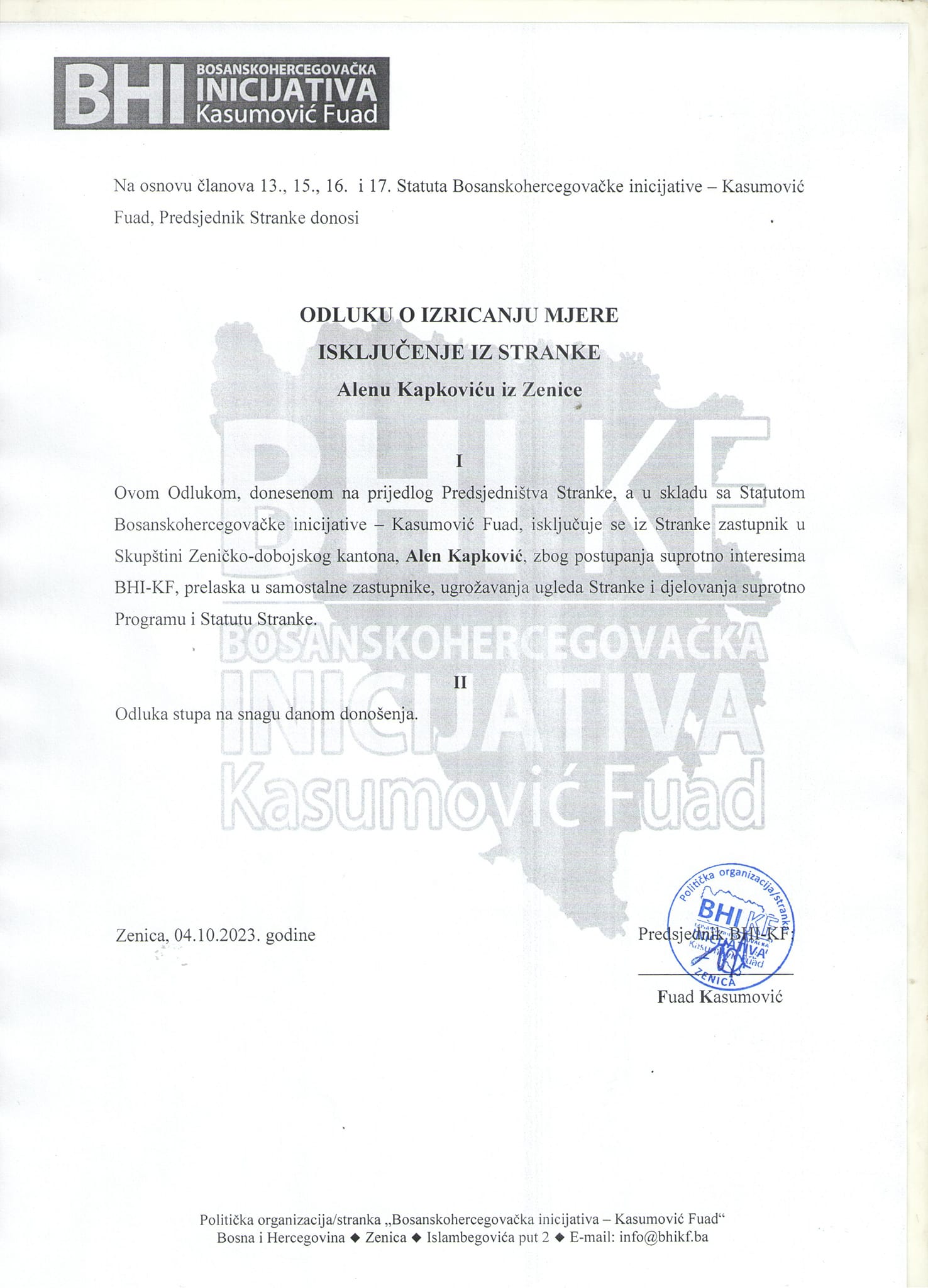 Iako je Alen Kapković prije više od mjesec dana napustio klub i stranku, organi stranke su danas objavili dokument kojim istog isključuju iz članstva i svih organa stranke.