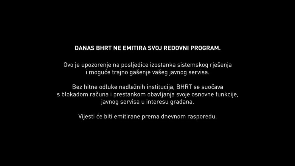 BHRT je u 7:00 sati jutros privremeno prekinuo emitovanje redovnog programa, a za danas je najavljeno vanredno obraćanje uprave ovog državnog javnog emitera. U toku dana će biti emitovane samo vijesti prema redovnom rasporedu.
