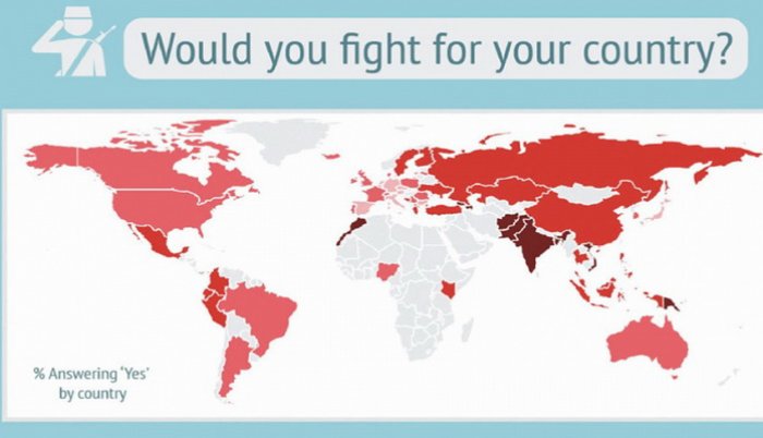 Prema podacima upisanim u mapu, vidi se da spremnost državljana da ratuju za svoje države opada sa istoka Evrope prema zapadu, pa su se na krajnjem zapadu našle zemlje čiji su građani najmanje spremni za rat.