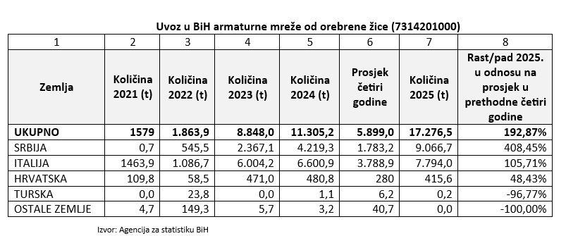 Primjera radi ukupan rast uvoza armaturnih mreža u BiH je u prošloj godini porastao za 192,87 posto u odnosu na četvorogodišnji prosjek.