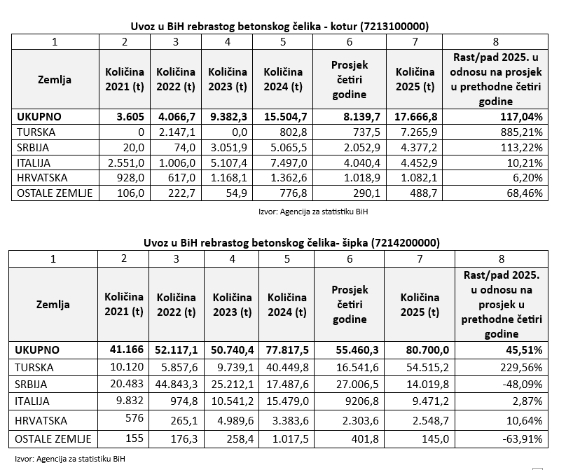 Takođe, kritičan je i rast uvoza iz Turske. Betonski čelik u kolutu bilježi rast uvoza iz ove zemlje za od 885 posto u odnosu na četvorogodišnji prosjek, dok je uvoz betonskog čelika u šipki veći za 229,56 posto.