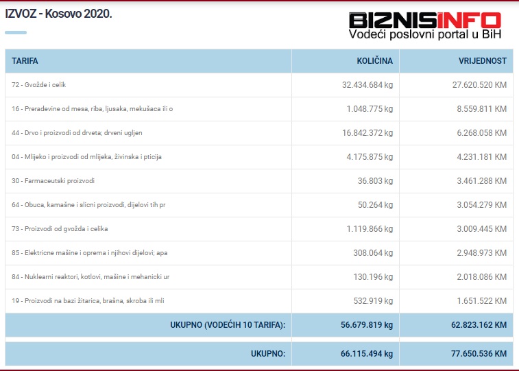 Do kraja godine izvoz iz BiH na Kosovo dostigao iznos od 77,6 miliona KM. To se može smatrati sjajnim rezultatom za devet mjeseci nakon ukidanja taksi.