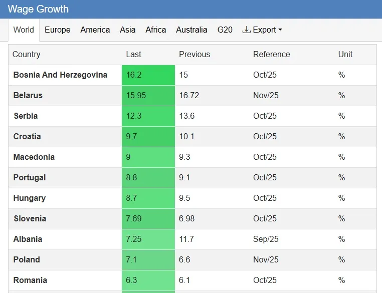 Time su zemlje Zapadnog Balkana i šire regije ubjedljivo nadmašile razvijene ekonomije, uključujući Sjedinjene Američke Države, gdje je rast plata iznosio oko 5 posto, te brojne zemlje Evropske unije, prema podacima stranice Trading Economics.