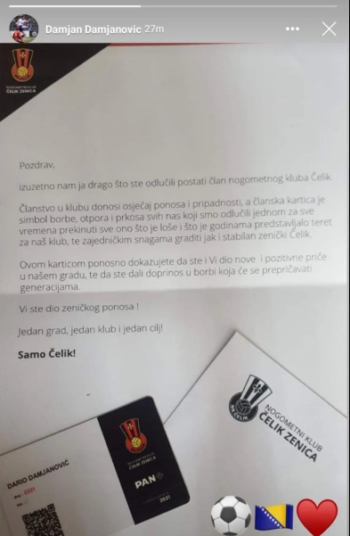 Danas se na društvenim mrežama Damjanović pohvalio da je dobio kovertu, odnosno člansku karticu NK Čelik za ovu godinu. Svakako lijep gest ovog bivšeg igrača Čelika, koji sigurno želi, kao i većina bh. javnosti da se zenički klub što prije vrati u društvo najboljih klubova u BiH.