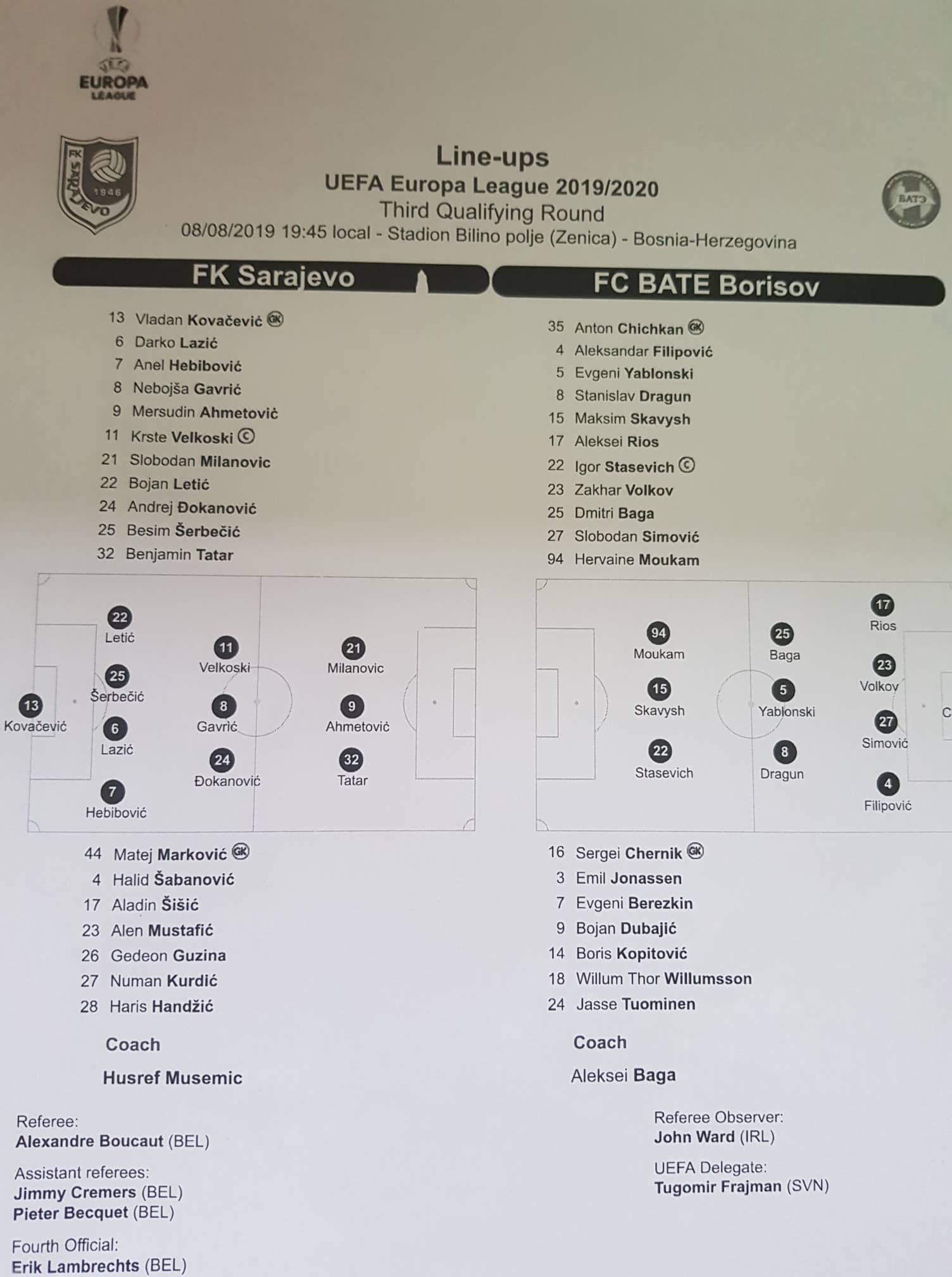 Uokviru  trećeg pretkola Evropske lige u Zenici su igrali bh. prvak Sarajevo i bjeloruski prvak Bate Borisov, na  stadionu “Bilino polje“ i pod svjetlošću reflektora. Podsjećamo, Olimpijski stadion u Sarajevu, „Asim Ferhatović Hase“ na Koševu, ne ispunjava UEFA-ine za dobijanje treće kategorije, koja je potrebna da bi se utakmice 3. i 4. pretkola igrale na ovom stadionu, pa se utakmica igrala u Zenici.