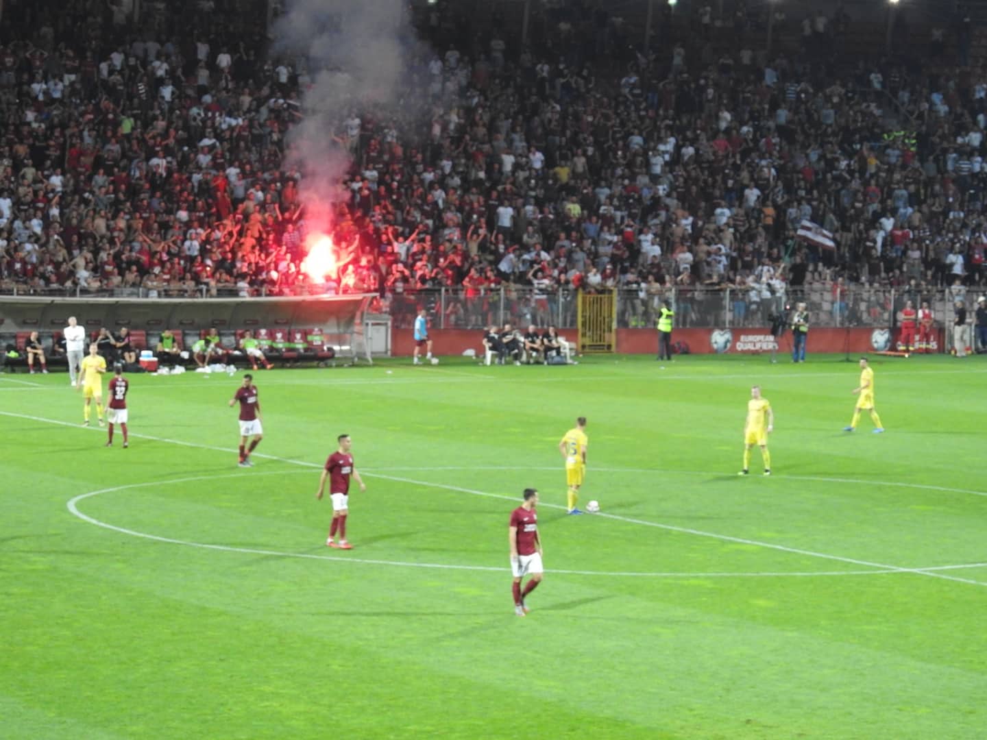 -77.minuta, belgijski sudija prekida utakmicu zbog ubacivanja baklje na teren. Igrači se već nalaze u svlačionici stadiona Bilino polje i neizvjesno je kada će se susret nastaviti. Nakon 7-8 minuta igrači su ponovo na terenu i susret je nastavljen.