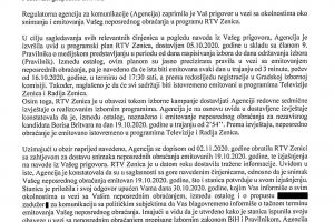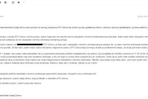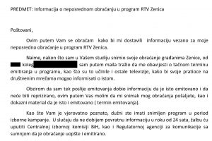 Nakon što RTV Zenica nije odgovorila u roku koji sam im postavio, dopis sam uputio i Centralnoj izbornoj komisiji i Regulatornoj agenciji za komunikacije.