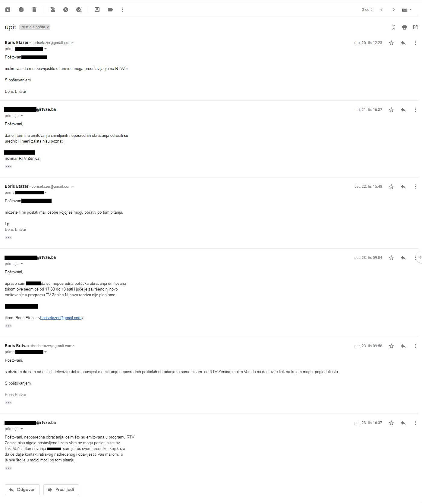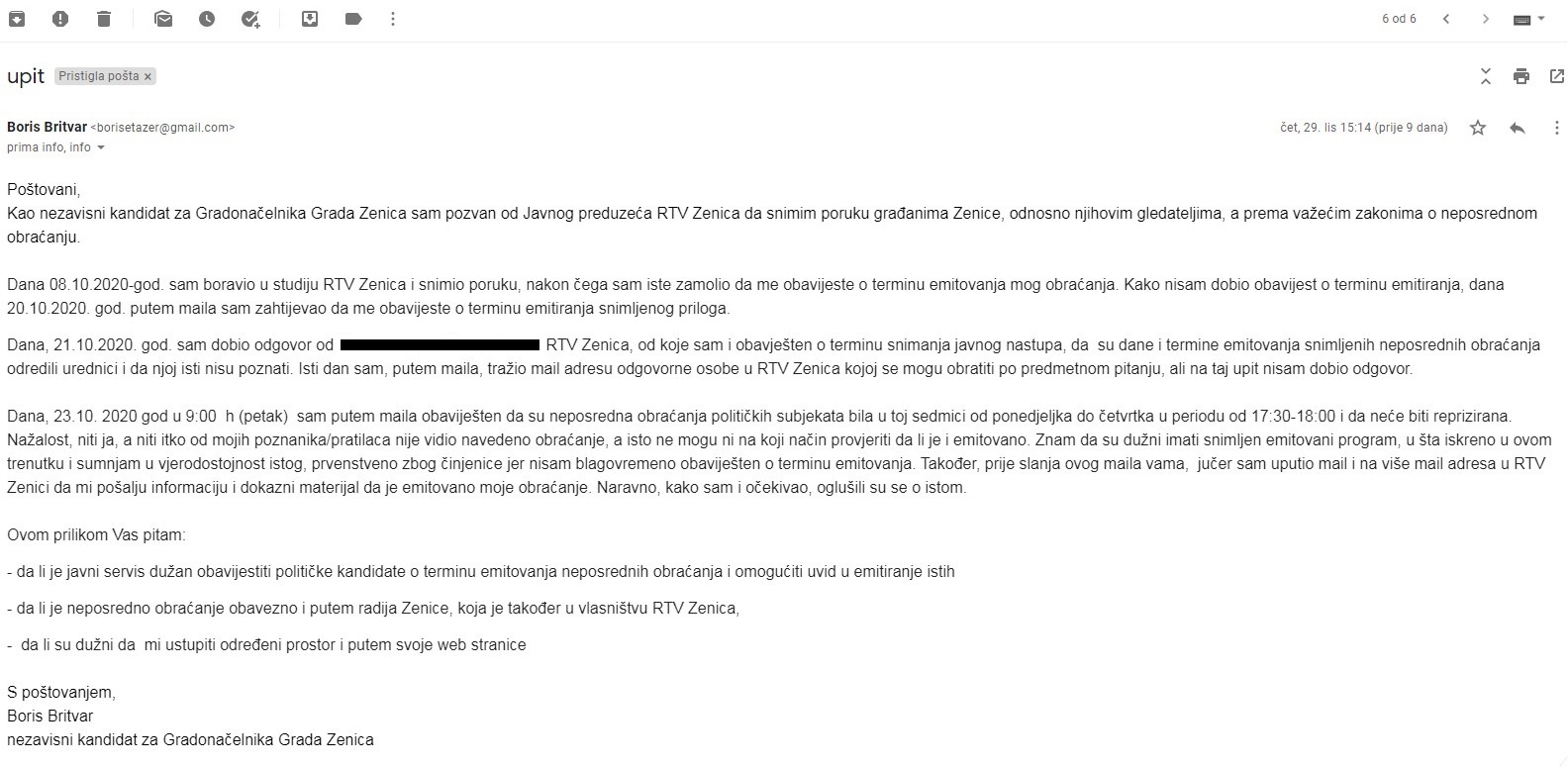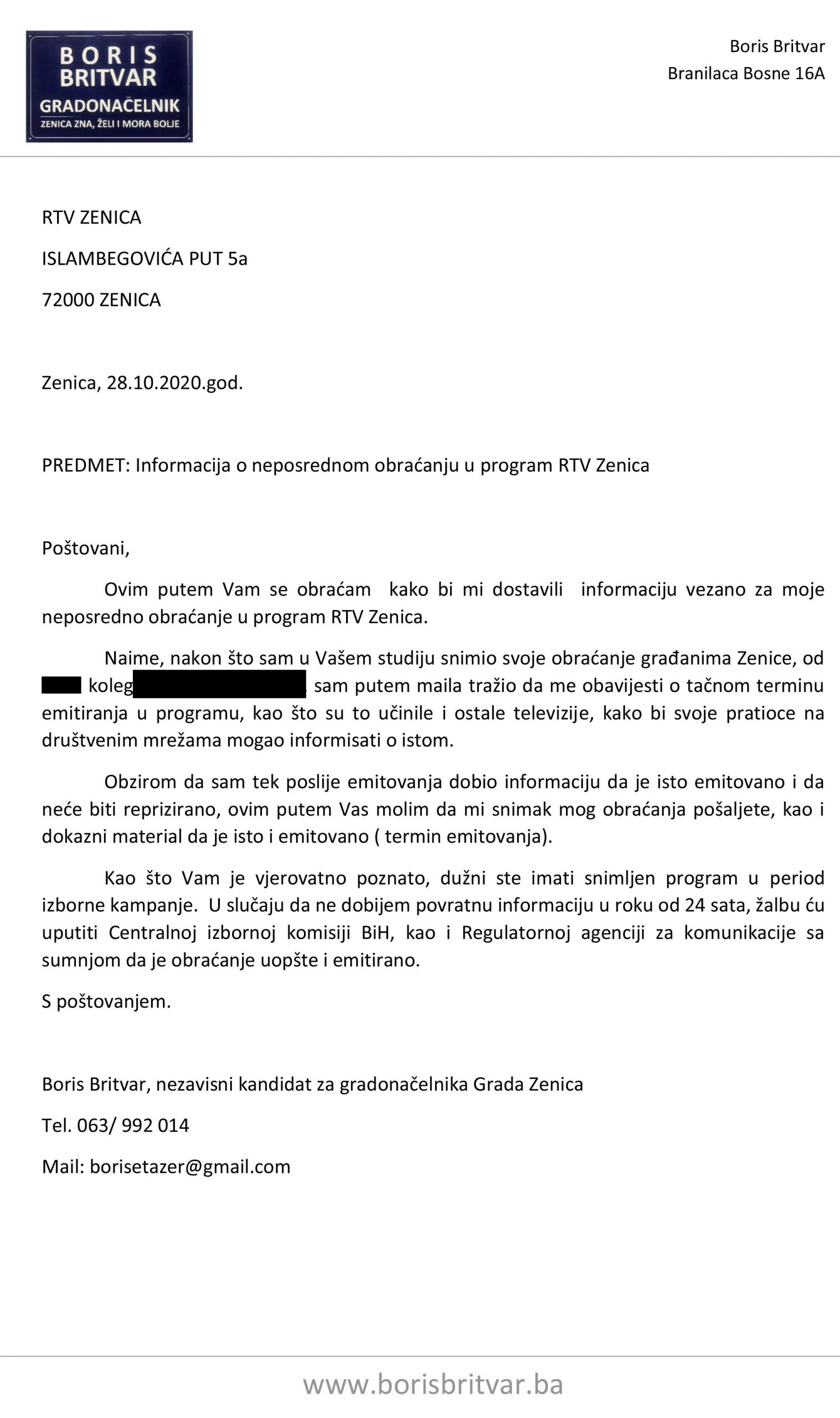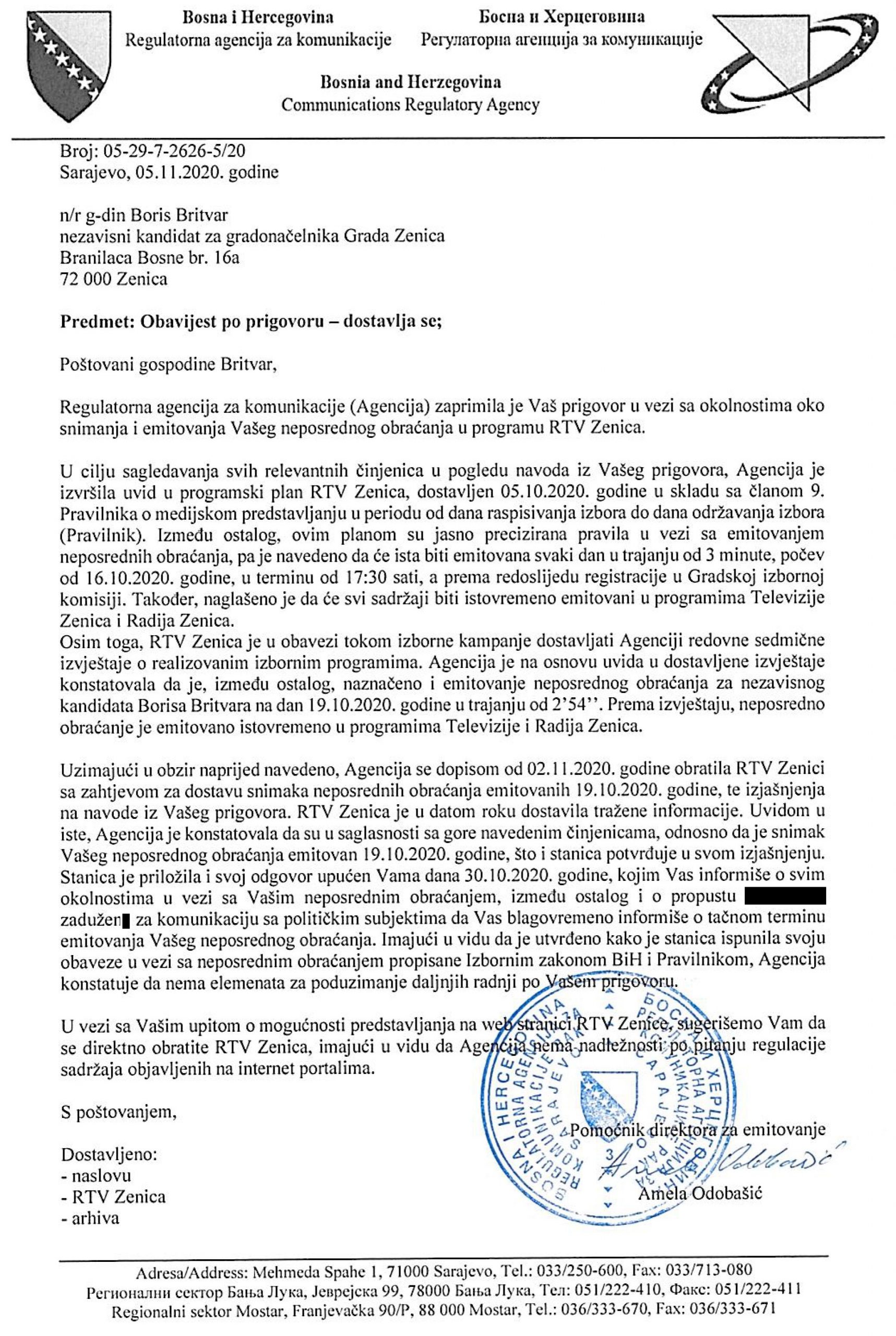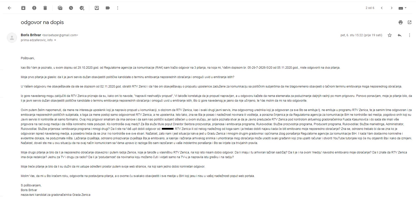 Nakon što RTV Zenica nije odgovorila u roku koji sam im postavio, dopis sam uputio i Centralnoj izbornoj komisiji i Regulatornoj agenciji za komunikacije.