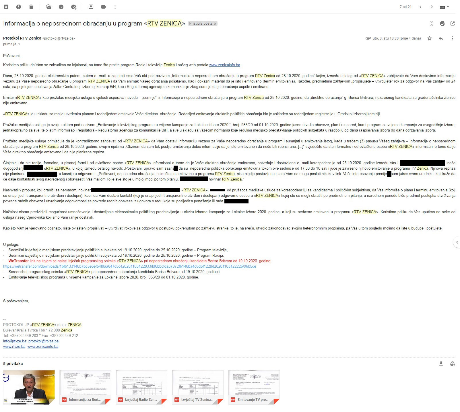 Obzirom da ni 12 dana od snimanja obraćanja nisam dobio informaciju kada i da li će uopšte biti emitovana moja poruka, uputio sam mail novinaru RTV Zenica (čiji identitet krijem iz poštovanja prema istom), a kompletnu korespondenciju možete pogledati u prilogu ovog saopštenja.
