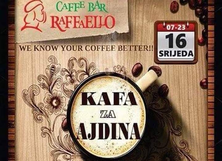 Srijeda 16.9. u cafe bar Raffaelo čitav dan – kafa za Ajdina… sav prihod od prodaje kafa ide za Ajdinovo liječenje… Ako ste planirali piti...
