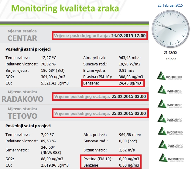 Hoće li ovaj monitoring IKAD proraditi kako treba? Za milion i po KM dobili smo neispravnu opremu. Danas je na displeju cijeli dan SO2 169. Mjerne stanice u...