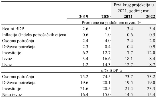 Prema aktuelnoj projekciji (Tabela 1), u 2021. godini se očekuje rast ekonomske aktivnosti od 3,4%, što je za 70 baznih poena više od projekcije prije šest mjeseci. Iako je početak 2021. godine takođe pod uticajem koronakrize, snažniji od očekivanog oporavak u određenim pokazateljima visoke frekvencije, poput industrijske proizvodnje i izvoza roba, u prvom kvartalu, upućuje na dinamičniju ekonomsku aktivnost u 2021. godini.