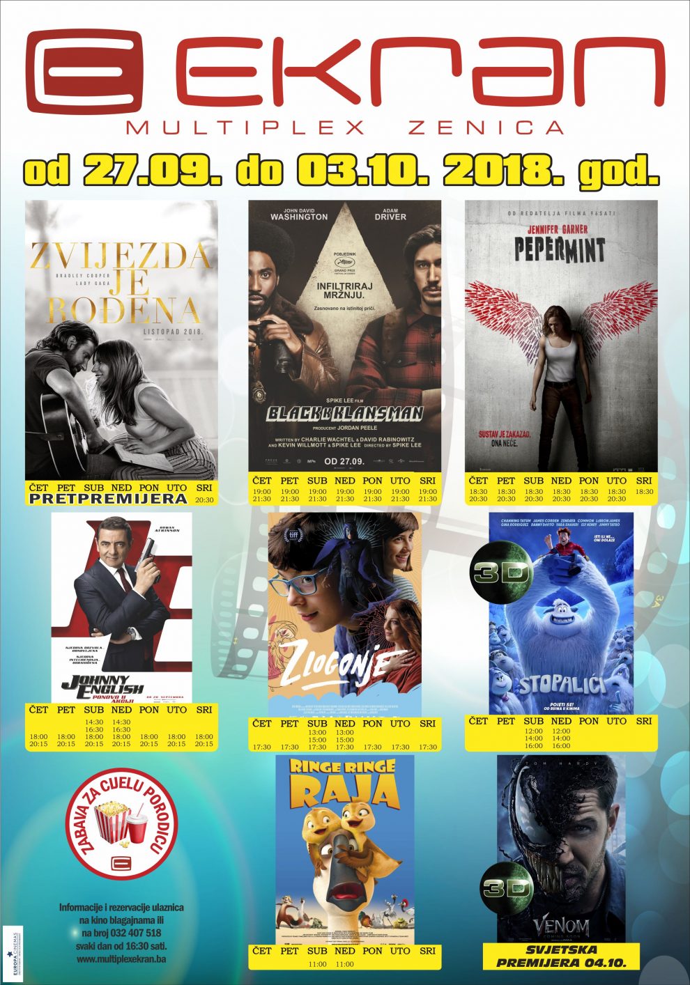Četiri nova filma u programu Multiplex Ekran Zenica od 3. oktobra – Krimi komedija o afro-američkom detektivu “BLACKKKLANSMAN”, akcija sa Jannifer Garner u glavnoj ulozi “PEPERMINT”, porodični igrani film za sve uzraste “ZLOGONJE” od 27. septembra na programu Multiplexa Ekran Zenica i pretpremijerna projekcija muzičke drame “ZVIJEZDA JE ROĐENA” od 03. oktobra u Multiplexu Ekran Zenica