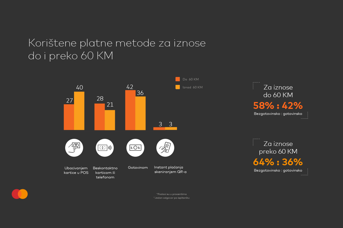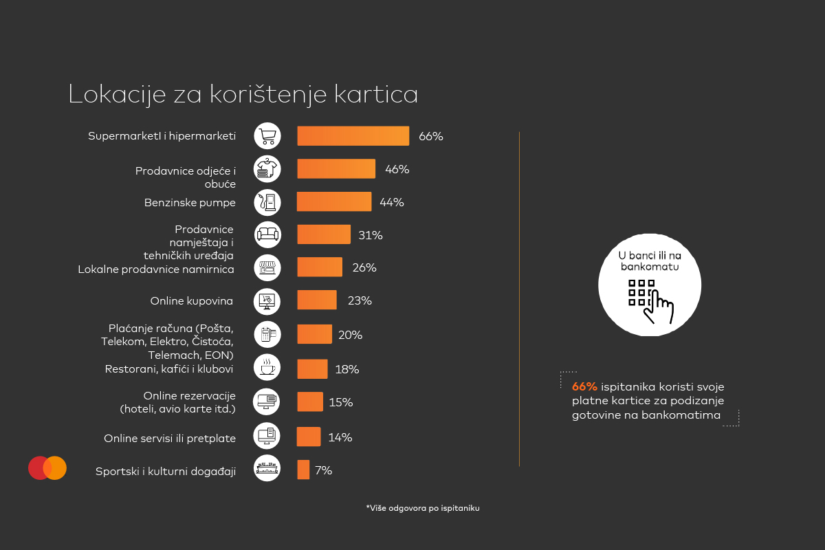 Platne kartice se najčešće koriste za kupovine u supermarketima (66%), prodavnicama odjeće i obuće (46%), na benzinskim pumpama (44%), te prodavnicama namještaja i tehničkih uređaja (31%). S druge strane, medicinske ustanove (30%) i lokalni marketi (21%) su najčešće pominjane lokacije na kojima bi ispitanici željeli plaćati karticama, što je još jedan pokazatelj navike bezgotovinskih plaćanja koju korisnici bezgotovinskih plaćanja u BiH stiču.