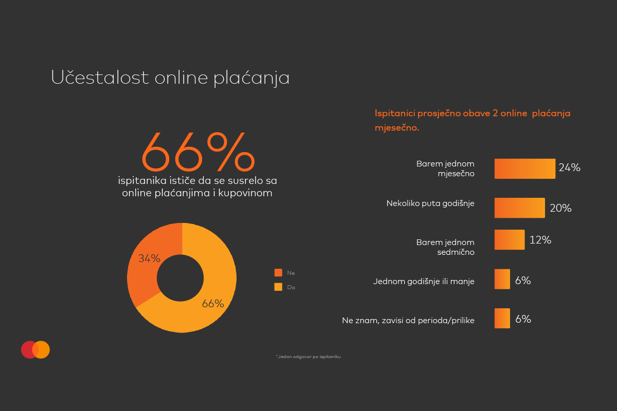 MasterIndex pokazaju da se 66% ispitanika susrelo sa online plaćanjima i kupovinom. Uglavnom se online plaćanja obavljaju na mjesečnom nivou (24%), dok 12% ispitanika praktikuje da plaća online makar jednom sedmično, što je blagi rast od (3%) u odnosu na prošlogodišnje istraživanje.