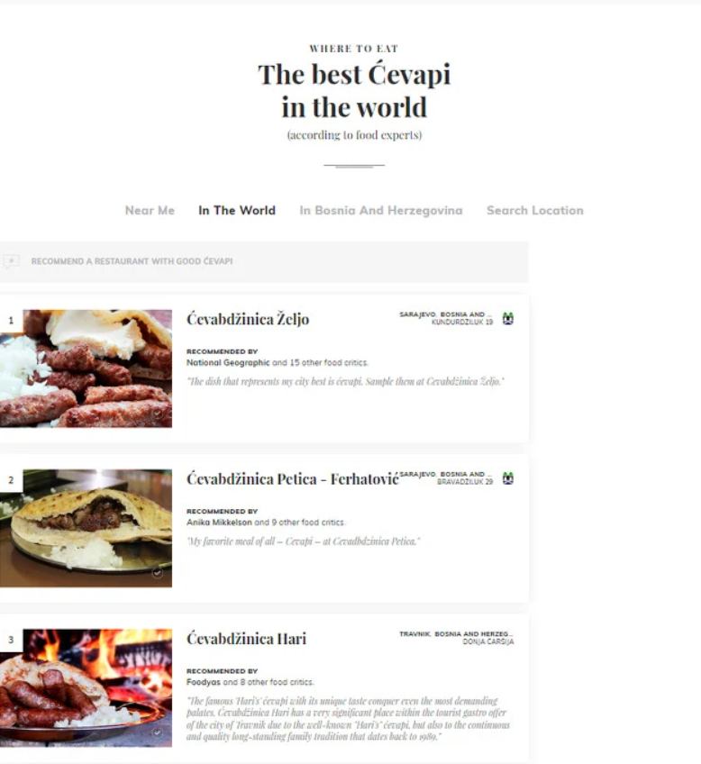Prema njihovom popisu od ukupno deset lokacija, na prvom mjestu je ćevabdžinica Željo, na drugom Petica – Ferhatović, a na trećem ćevabdžinica Hari iz Travnika.